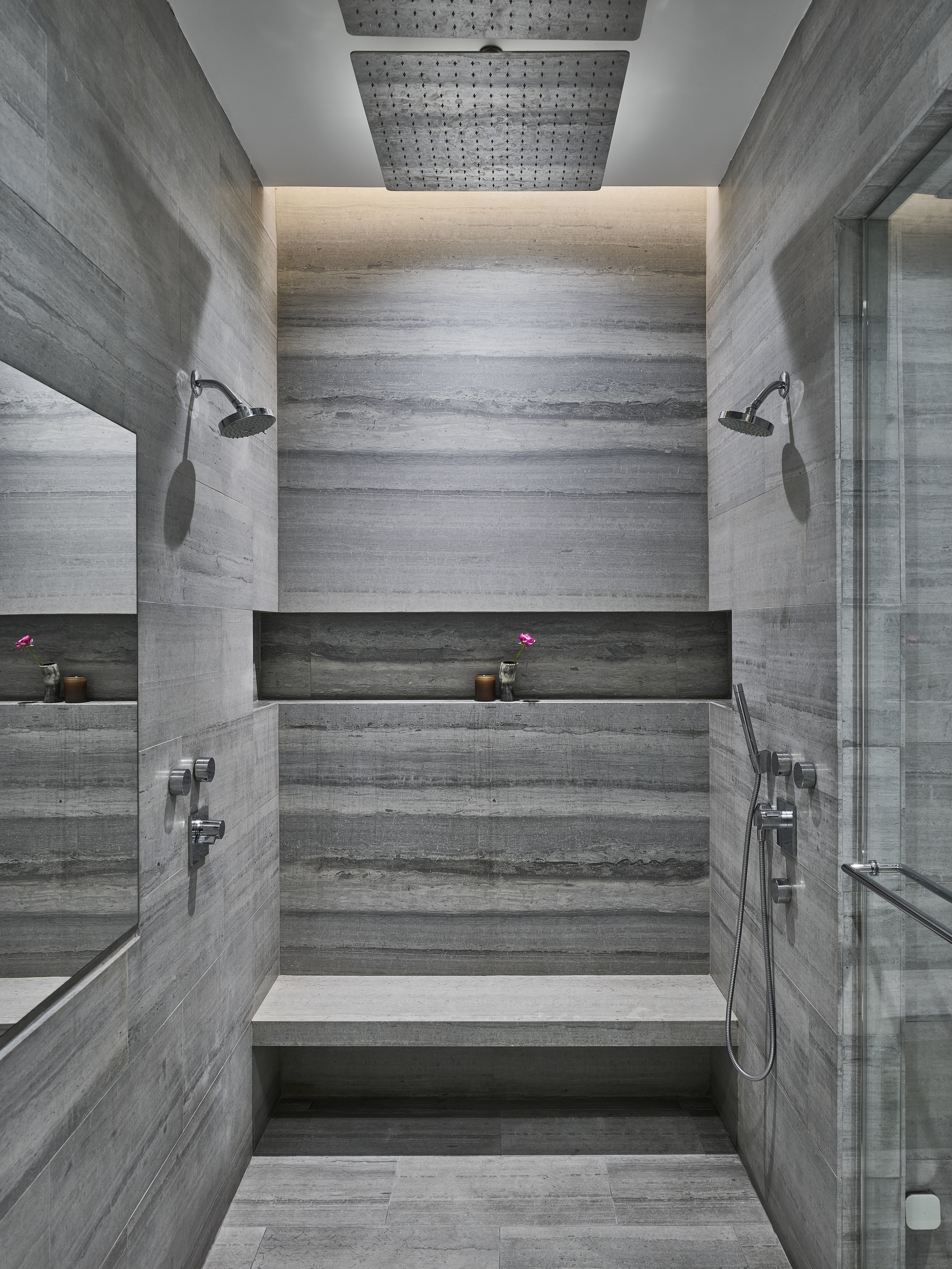 Primary bathroom facing shower and steam room on the right